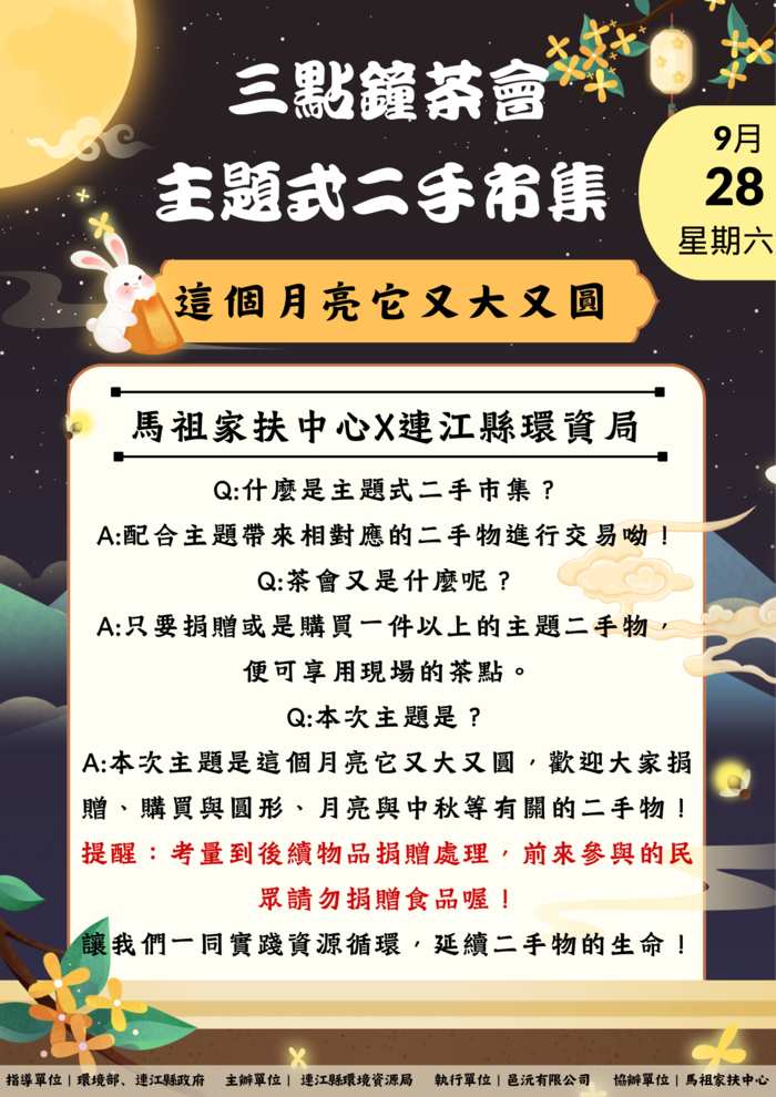 三點鐘茶會主題式環保二手市集,本月的主題是「這個月亮它又大又圓」,前來的民眾可攜帶與圓形、月亮或與中秋有關的物品,只要一切能聯想到中秋節即可,比如:圓形的盤子、黃色的絲巾、月亮造型的小夜燈等,只要捐贈此類型二手物,便可以入座參與享受此月的下午茶茶會。考量到後續物品捐贈處理,前來參與的民眾請勿捐贈食品類。連江縣環資局表示,三點鐘茶會主題式環保二手市集除了與馬祖家扶中心結合,一同做愛心外,亦配合環境政策,推動循環容器的使用及二手物的循環經濟,並藉由活動的舉辦播放循環經濟的影片,宣傳理念的同時,搭配主題式的茶會增添樂趣與美味,歡迎鄉親攜手一同前來參與主題式茶會。