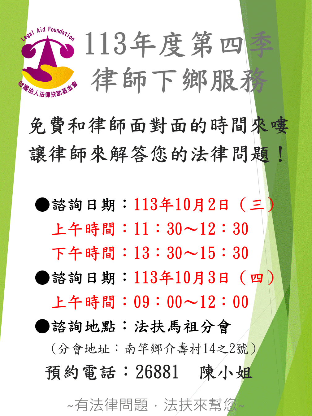 各位鄉親好~10月2日及3日有免費現場的法律諮詢,居住北竿或東引或莒光,若有法律相關問題,亦可來電預約,當日律師會親自電話為您服務喔~法扶馬祖分會敬上
