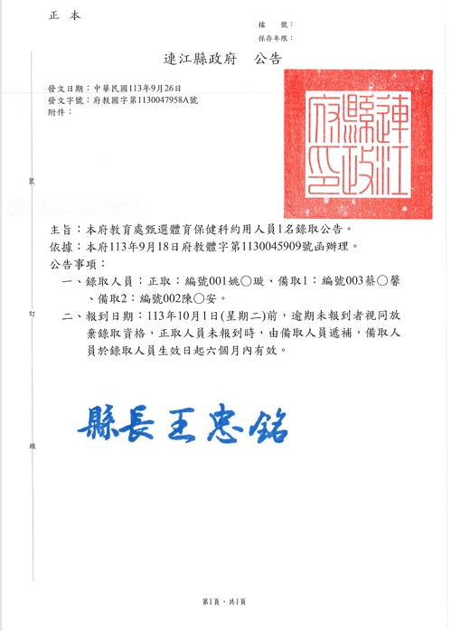 本府教育處甄選體育保健科約用人員1名錄取公告