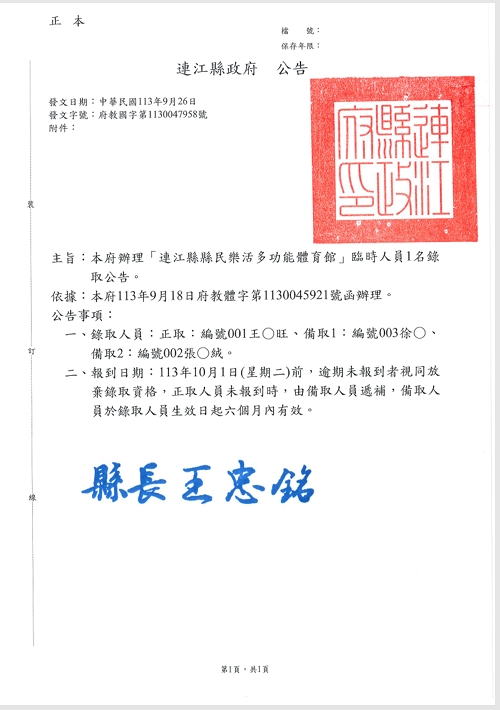 本府「連江縣縣民樂活多功能體育館」臨時人員1名錄取公告