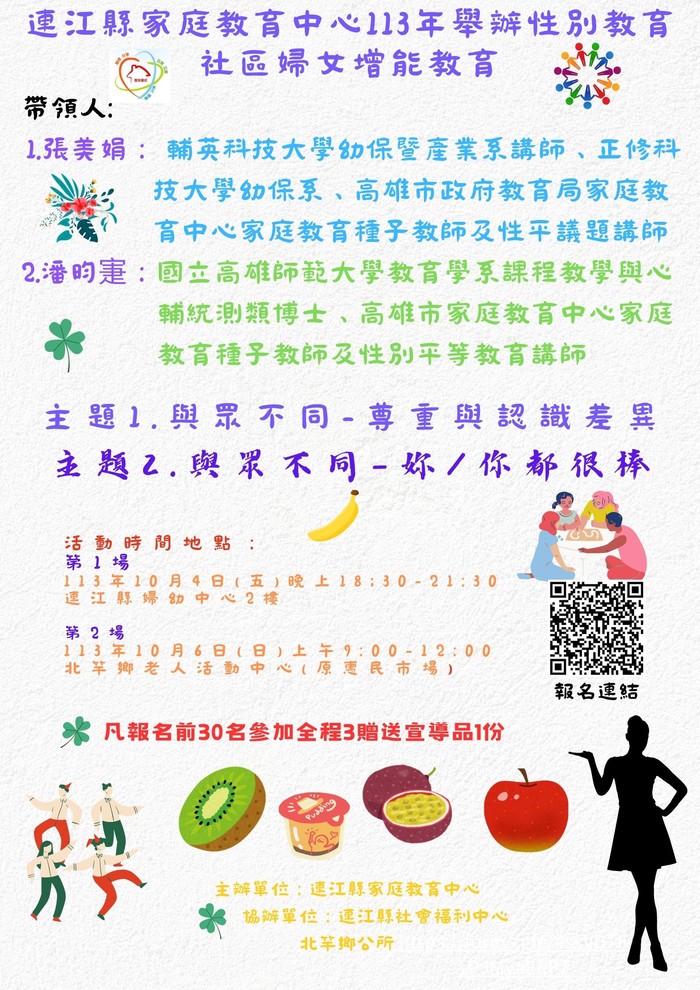 第1場:113年10月4日(五)晚上18:30- 21:30 連江縣婦幼中心2樓