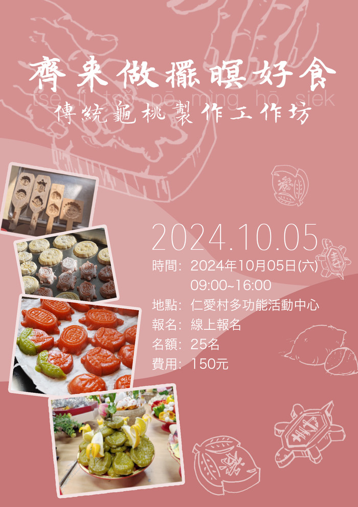 10/13(日) 傳統龜桃製作工作坊 --閱讀人次 : 807 原訂10/05 工作坊因颱風因素改期至10/13