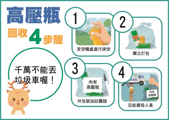 近期環資局執行垃圾破袋抽檢時,發現有民眾將高壓瓶罐參雜於垃圾中,常見的高壓瓶罐有:卡式爐瓦斯罐、定型液、防曬噴霧、髮膠噴霧、殺蟲劑、噴漆、空氣清新劑、防腐蝕劑、除臭劑、潤滑劑…等,係屬於公告應回收容器「金屬類」,其安全回收4步驟為:「確認用完、單獨打包、加註示警、交給資收」。