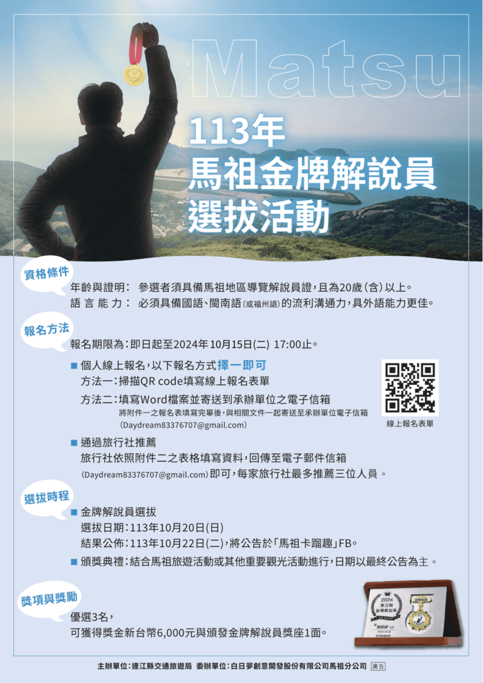 由連江縣交通旅遊局主辦的「馬祖金牌解說員選拔活動」即日起正式開放報名。這是馬祖地區史上第一次金牌解說員評選,優勝者將不僅獲得象徵專業與榮譽的「金牌解說員」稱號,還有機會在未來的縣府活動中,作為首選解說員,協助接待重要來賓,成為當地解說服務的標竿。