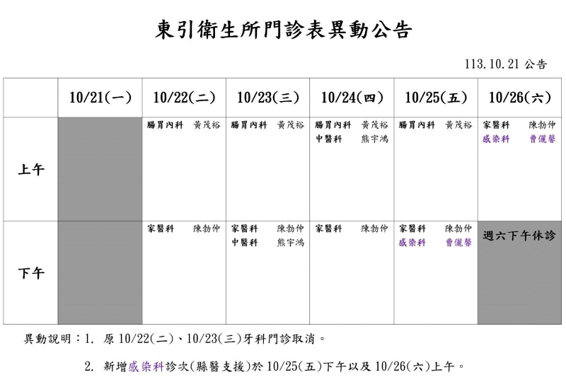 東引鄉衛生所通知:10/21~10/25早上8點30~早上11點30分有支援腸胃科黃醫生看診