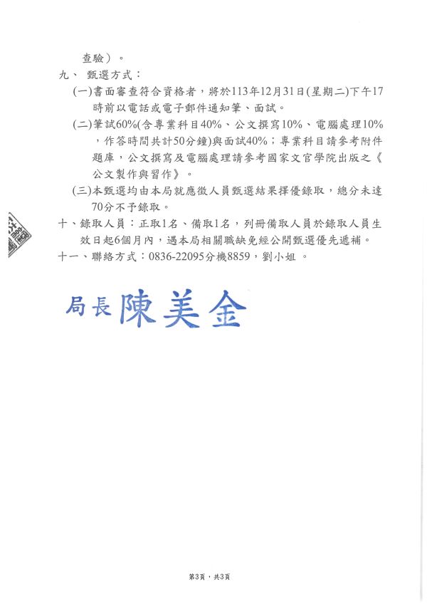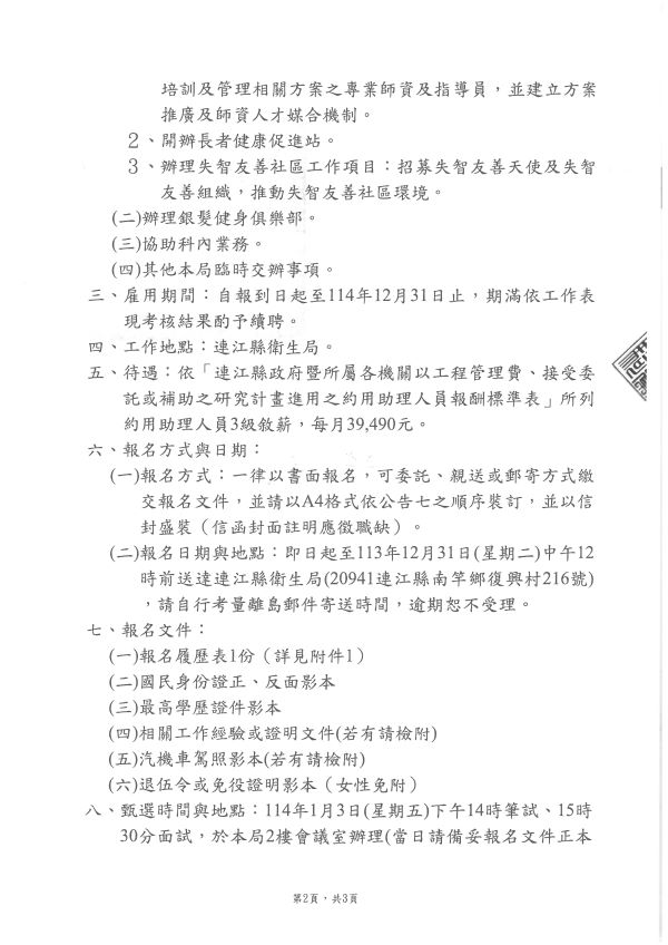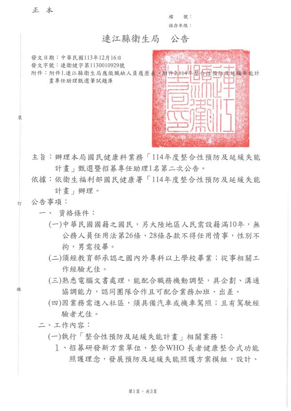 本縣衛生局甄選114年整合性預防及延緩失能計畫專任助理1名