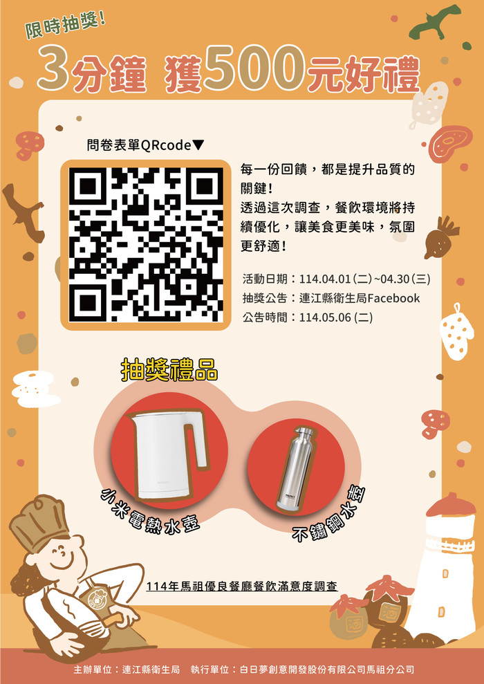 為了確保每一餐都安心入口,馬祖的餐飲業者們持續精進食品安全與衛生。讓用餐體驗更上一層樓,滿意度調查問卷正式開放填寫! 🍽️✨