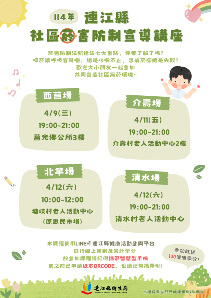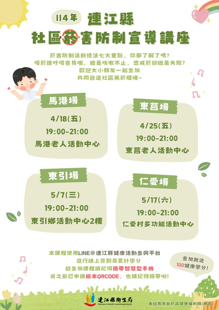 114年社區菸害防制宣導講座 開始囉 --閱讀人次 : 950 菸害防制法新修法七大重點,你都了解了嗎?