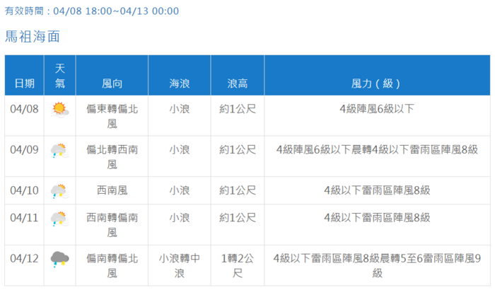 另外提醒至12日清晨馬祖地區易有局部霧或低雲影響能見度。