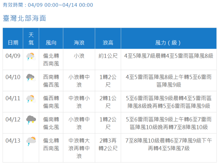 4/12西南風增強且鋒面通過,雷雨區陣風達到9級,臺灣北部海面局部甚至有到10級