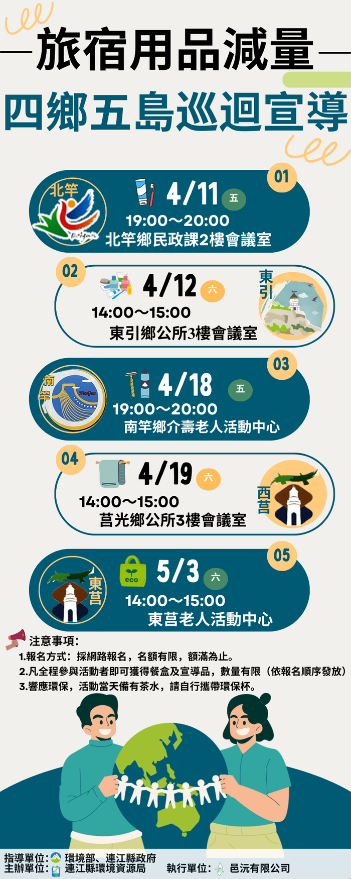 東引場:4月12日(六)14:00~15:00;地點:東引鄉公所3樓會議室報名網址: https://forms.gle/T7HYdDikgmtyEMWQ6