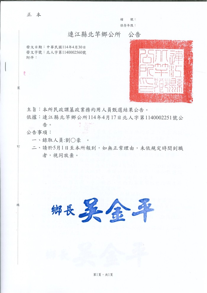 北竿鄉公所民政課墓政業務約用人員甄選結果公告