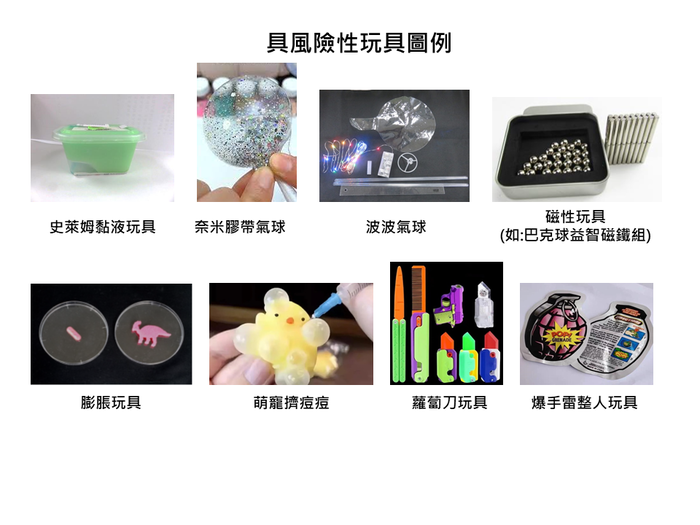 標準局特別提醒家長,針對一些新興玩具(如:史萊姆黏液玩具等,圖例如附),因深受國小學童喜愛,近期發現國內外已有事故案例,家長應多多留意孩子使用情形,例如: