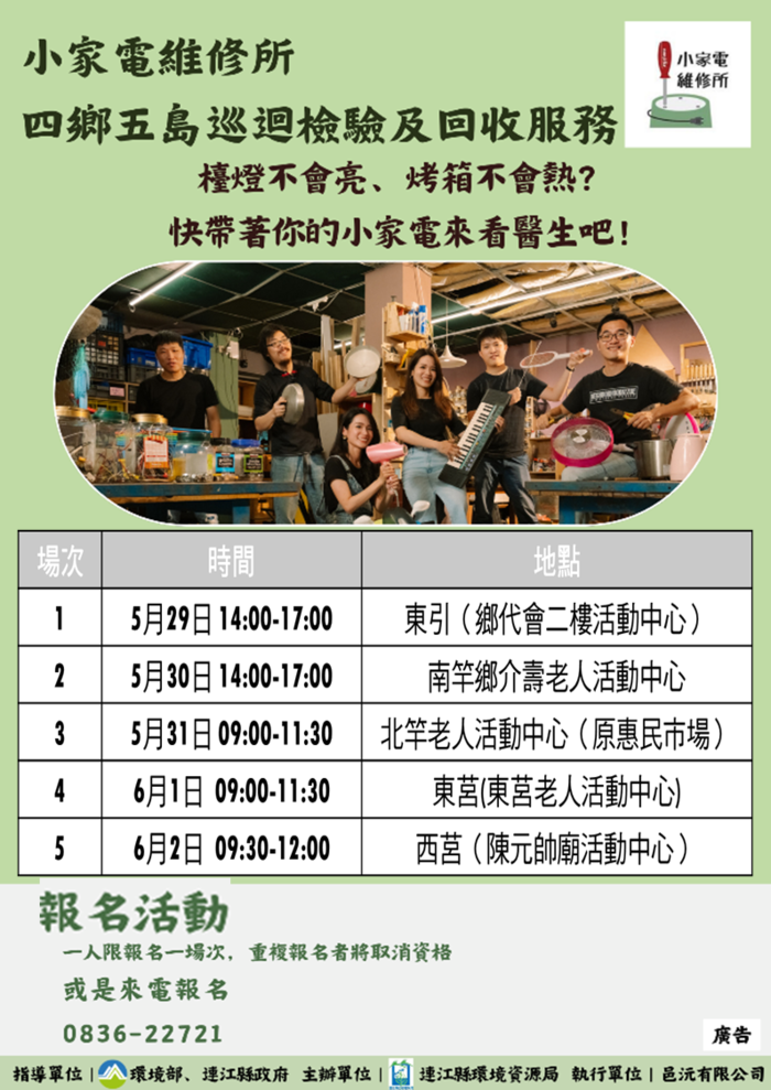 環資局將舉辦四鄉五島的免費巡迴維修活動,邀請台北小家電維修所團隊,並串聯台南、高雄維修社群夥伴來為民眾提供服務。活動內容包括小家電健康檢查、簡單維修、保養與互動教學,並教導民眾如何處理家電小故障,讓民眾亦能成為社區家電修繕種子。