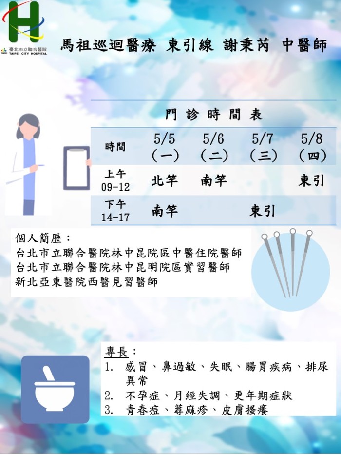 馬祖中醫巡迴醫療114/5/5-5/8由莒光線廖皓涵醫師、東引線謝秉芮醫師前往支援服務。