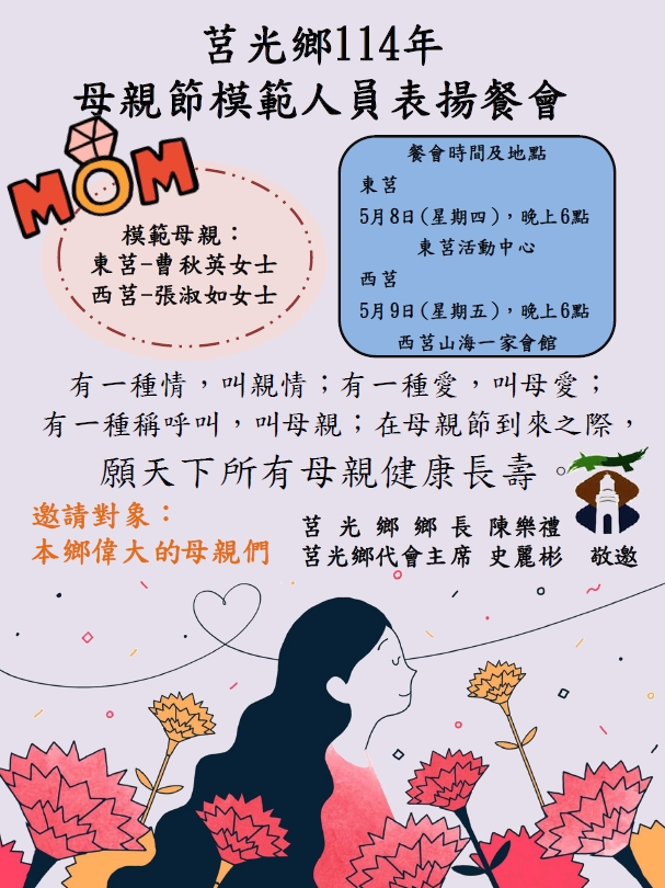為慶祝114年母親節,莒光鄉公所訂於5月8日(星期四)及5月9日(星期五)晚上6時舉辦模範母親表揚典禮暨慶祝餐會活動,邀請本鄉的母親們一同參加。