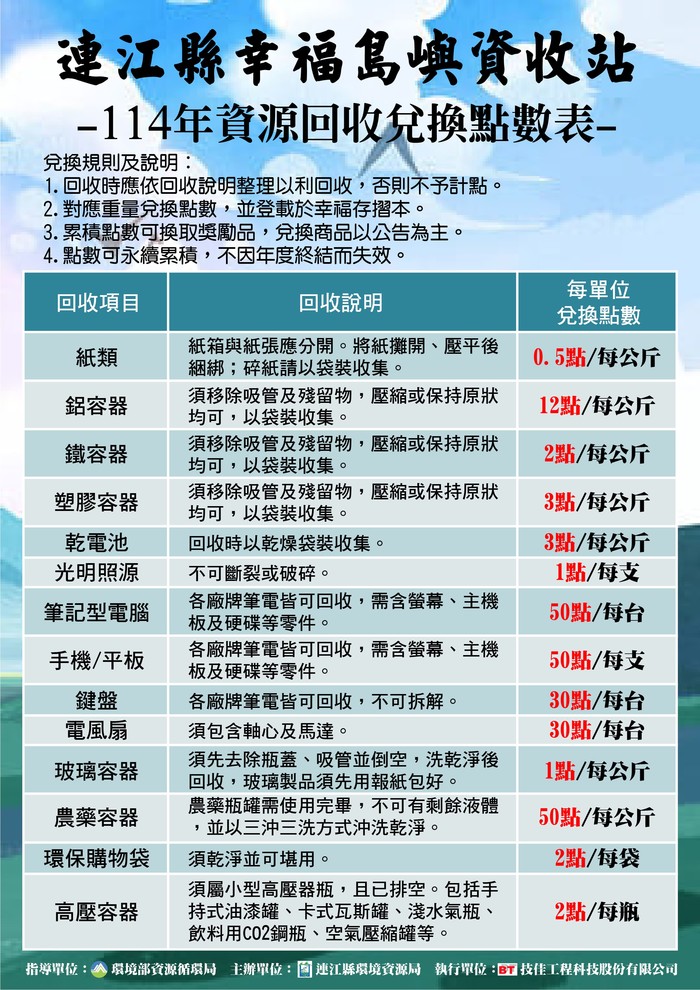 【復興】5/8幸福資收站公告 --閱讀人次 : 377 114年5月8日(星期四)下午午13:00~14:30,南竿幸福資收站於「復興村污水廠旁」進行資源回收服務,請各位鄉親踴躍參加。