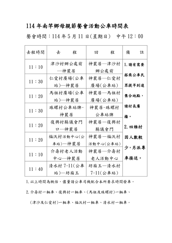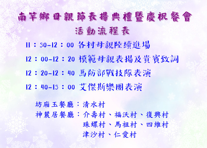 餐會舉辦場地為坊廂玉餐廳(清水村)及神辳居婚宴會館(介壽村、復興村、福沃村、珠螺村、馬祖村、四維村、津沙村、仁愛村與素食鄉親),誠摯邀請設籍在南竿鄉的媽媽們共同參加。