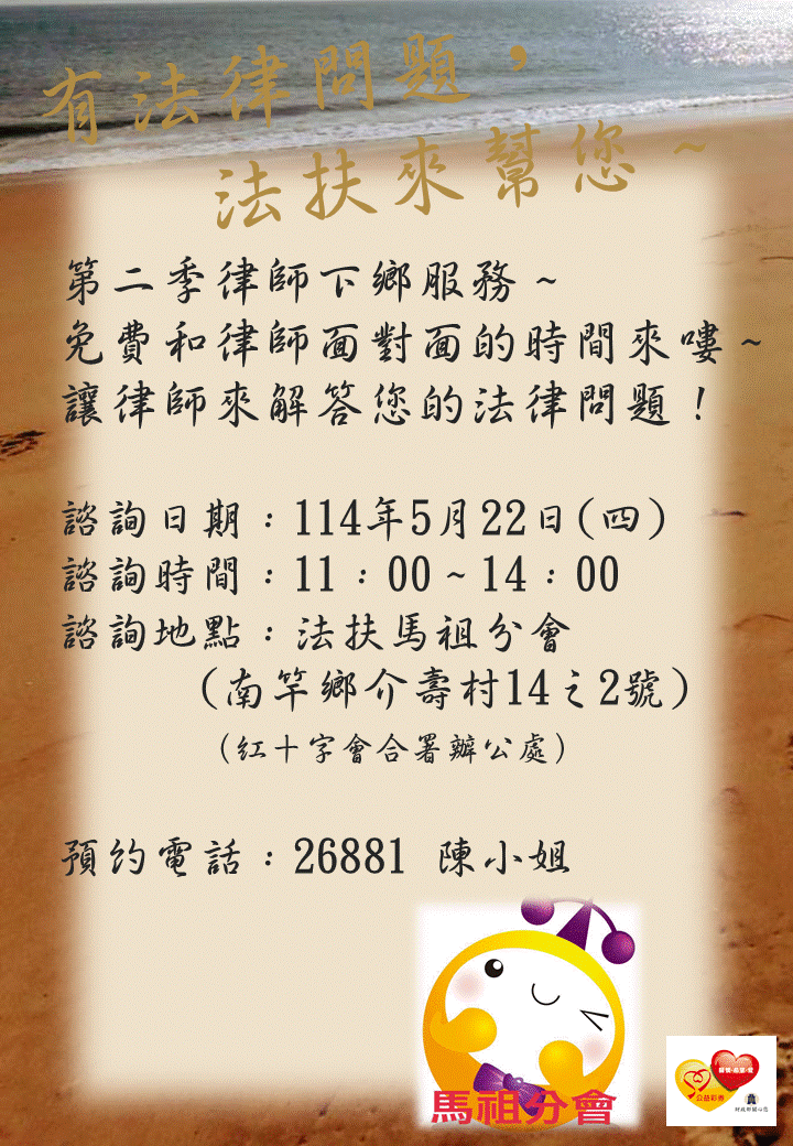 各位鄉親好,法扶5/22上午11點~14點,律師免費現場面對面法律諮詢服務,有法律問題或需求的民眾,敬請來電預約喔~