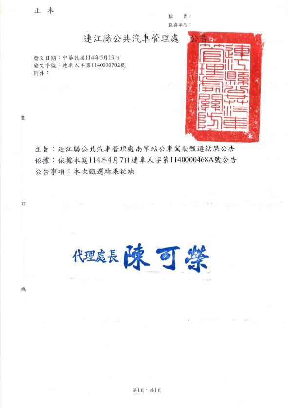 連江縣公共汽車管理處南竿站公車駕駛甄選結果公告