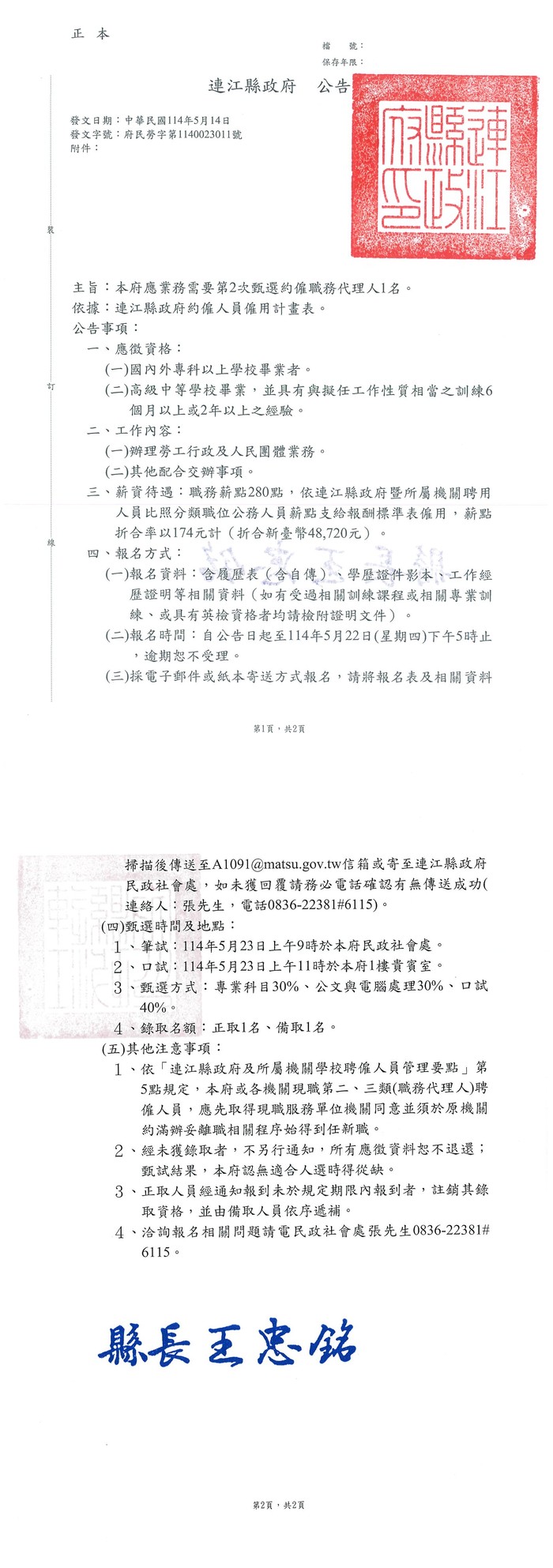 1.筆試:114年5月23日上午9時30分於連江縣政府民政社會處。
