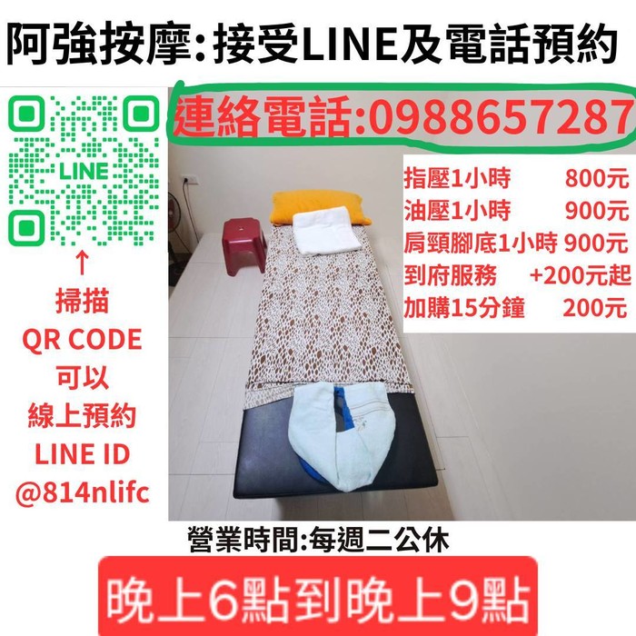 請各位有按摩需要的客人改預約其他日期的晚上6-9點,謝謝!