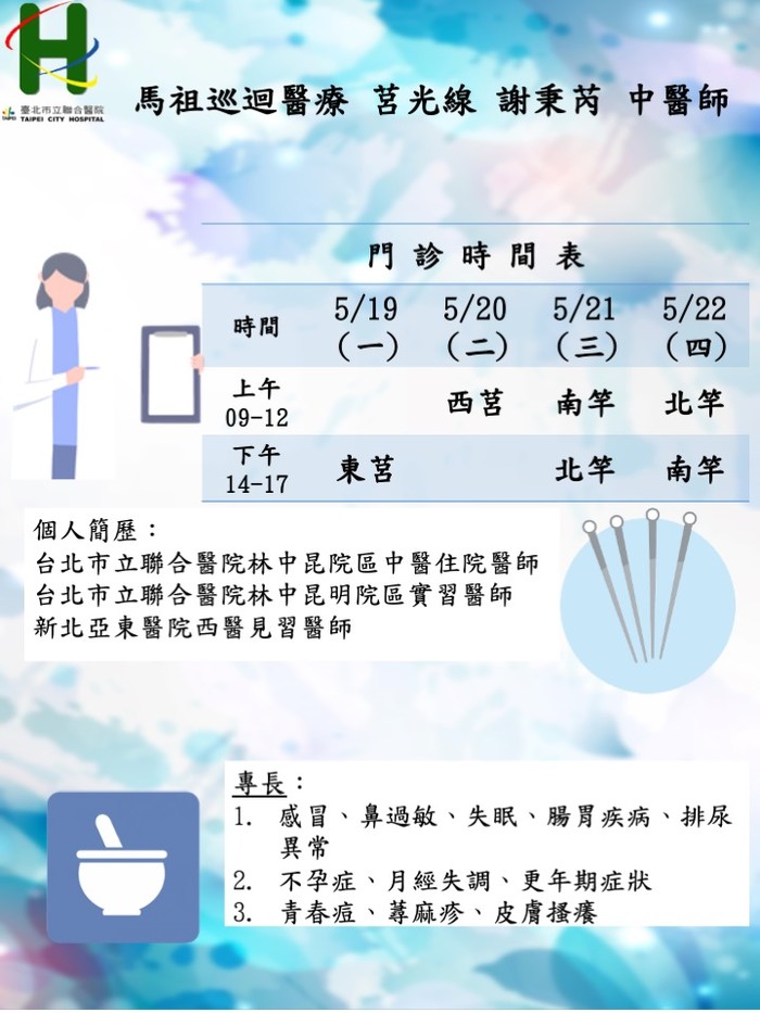 馬祖中醫巡迴醫療114/5/19-5/22由莒光線謝秉芮醫師、東引線徐敬閔醫師前往支援服務。