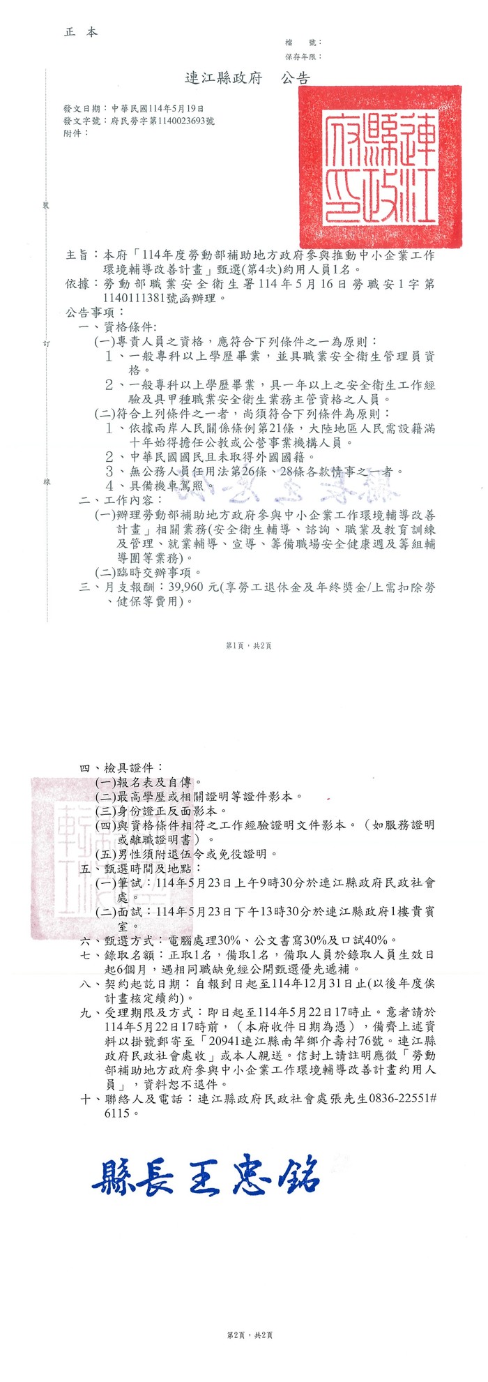 1.筆試:114年5月23日上午9時30分於連江縣政府民政社會處。