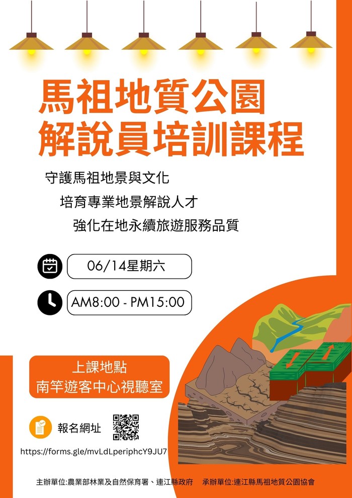 馬祖地質公園擁有世界少見的火山角礫岩地質與多樣的自然地景,是我們共同守護的自然寶藏。為提升馬祖整體旅遊服務品質、強化景點解說深度,培養在地專業解說人才,特別舉辦本次解說員培訓課程,誠摯邀請對地質教育與在地文化有熱情的朋友踴躍參加。
