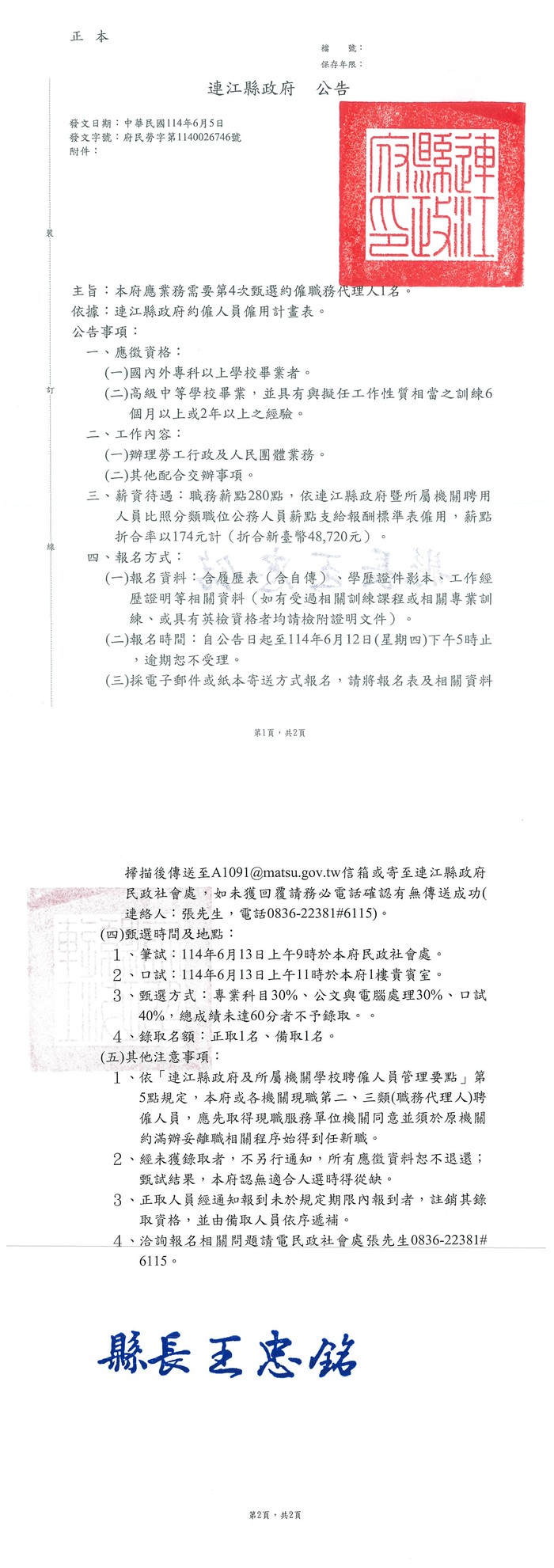 1、筆試:114年6月13日上午9時於本府民政社會處。