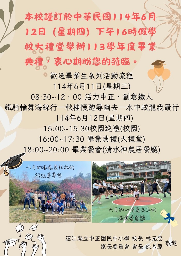 本校於114年6月11日(星期三)8點30分至12點辦理畢業生鐵人三項挑戰活動,自行車及路跑路線如圖(自行車學校出發行經清馬道→珠螺村→珠山電廠→連接橋→福清自行車道→救生大隊前廣場返回→原路線返學校→秋桂山路跑),請來往車輛減速慢行,禮讓學生,以策安全。另外,本校畢業典禮流程如圖。