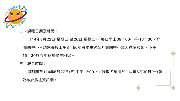 教育處暑期科學營隊第二階段報名 --閱讀人次 : 1468 🎉【教育處暑期科學營隊 第二階段報名開放】🎉