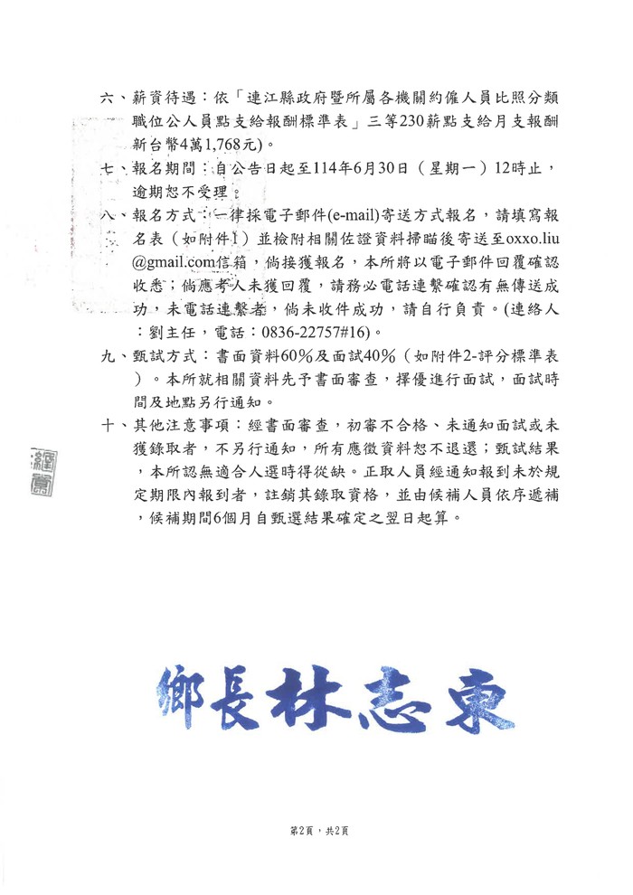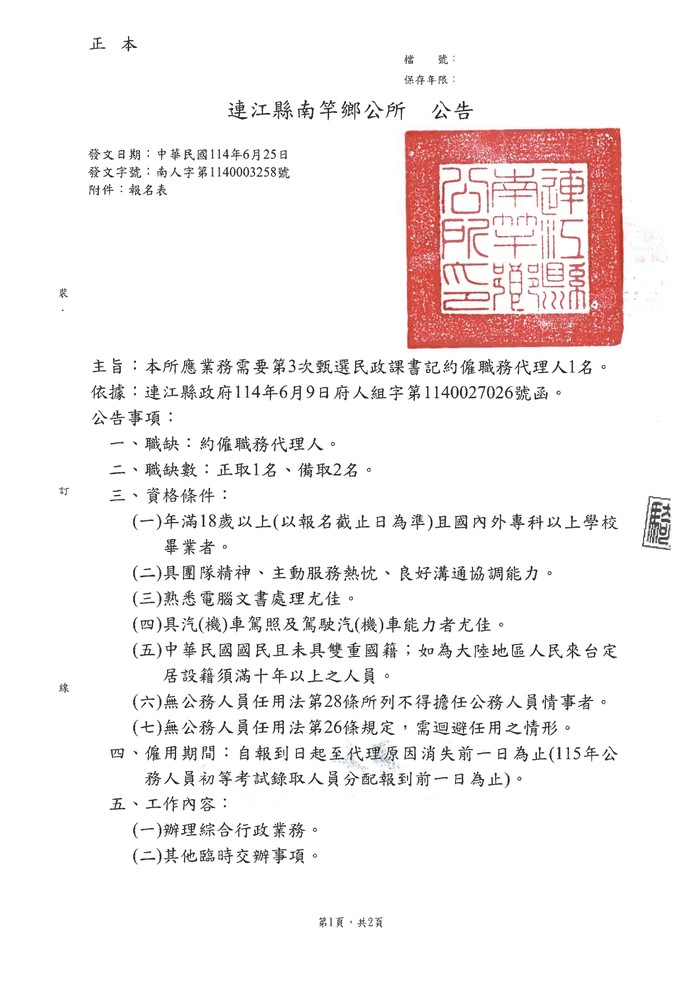 南竿鄉公所第3次甄選民政課書記約僱職務代理人1名