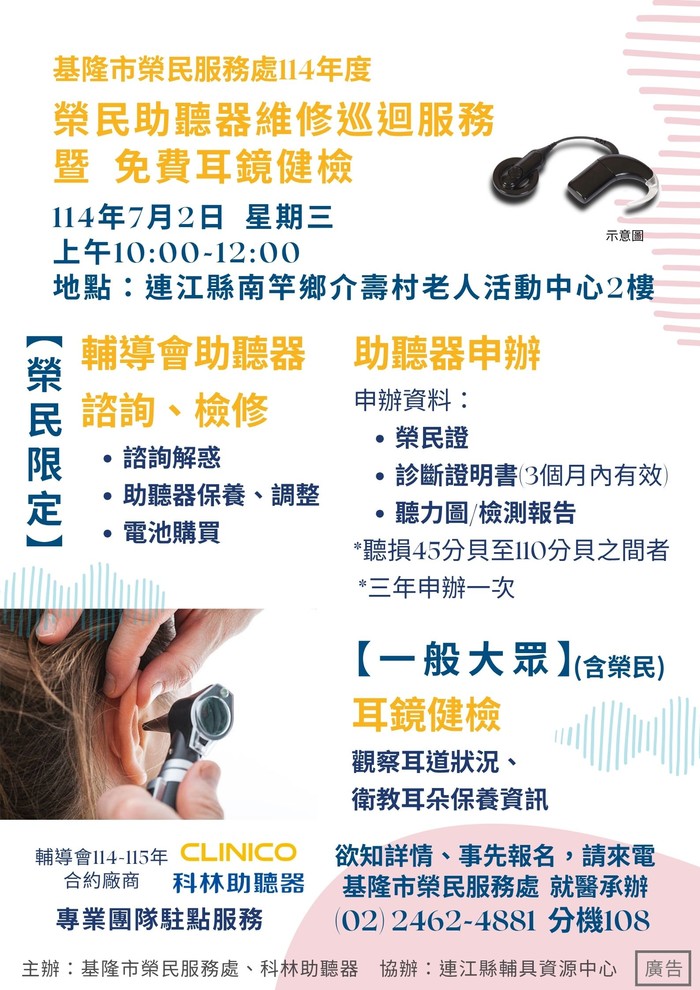 基隆市榮民服務處114年度辦理榮民助聽器維修巡迴服務暨免費耳鏡健檢
