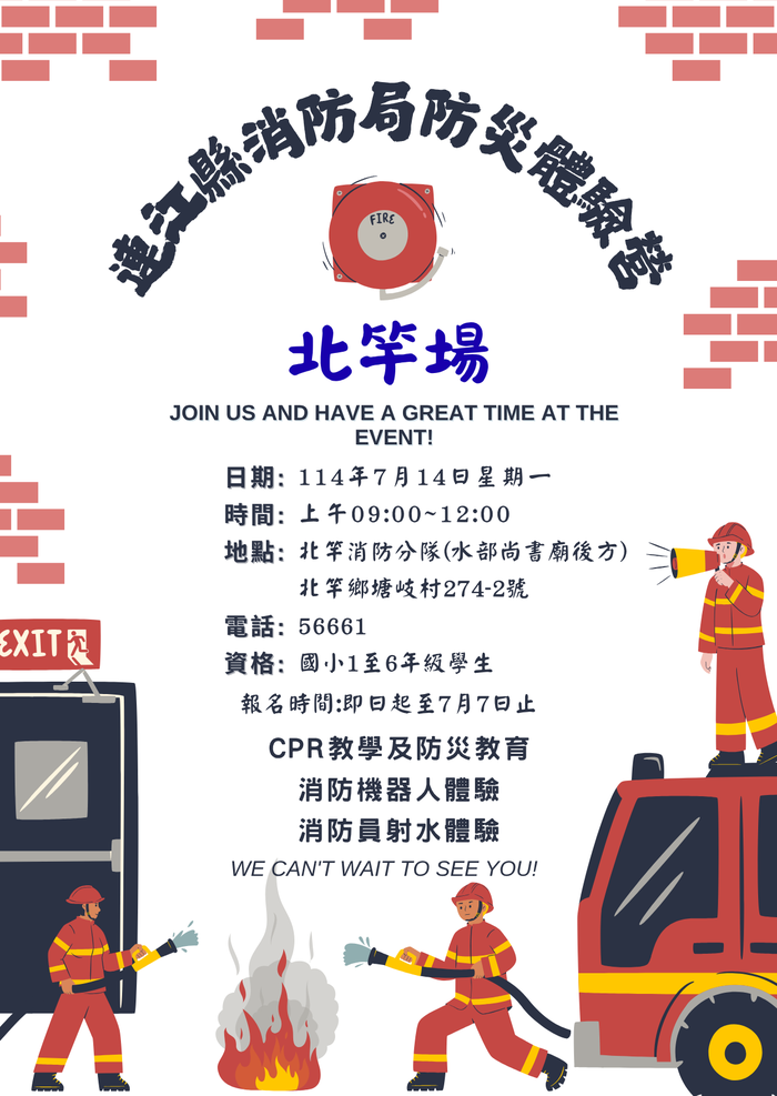 消防局7月14日辦理防災體驗營-北竿場 --閱讀人次 : 676 第一大隊北竿分隊預計7月14日辦理防災體驗營北竿場,歡迎北竿地區的小朋友踴躍參與。