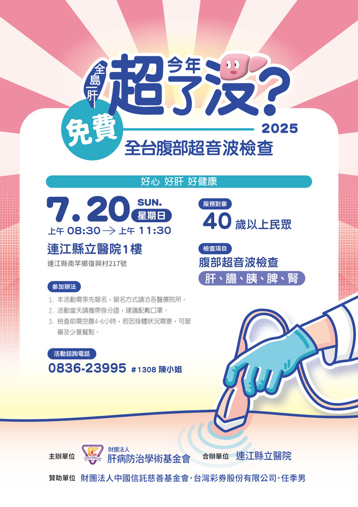 將於114年7月20日(星期日)上午舉辦免費腹部超音波檢查活動,限額25位民眾