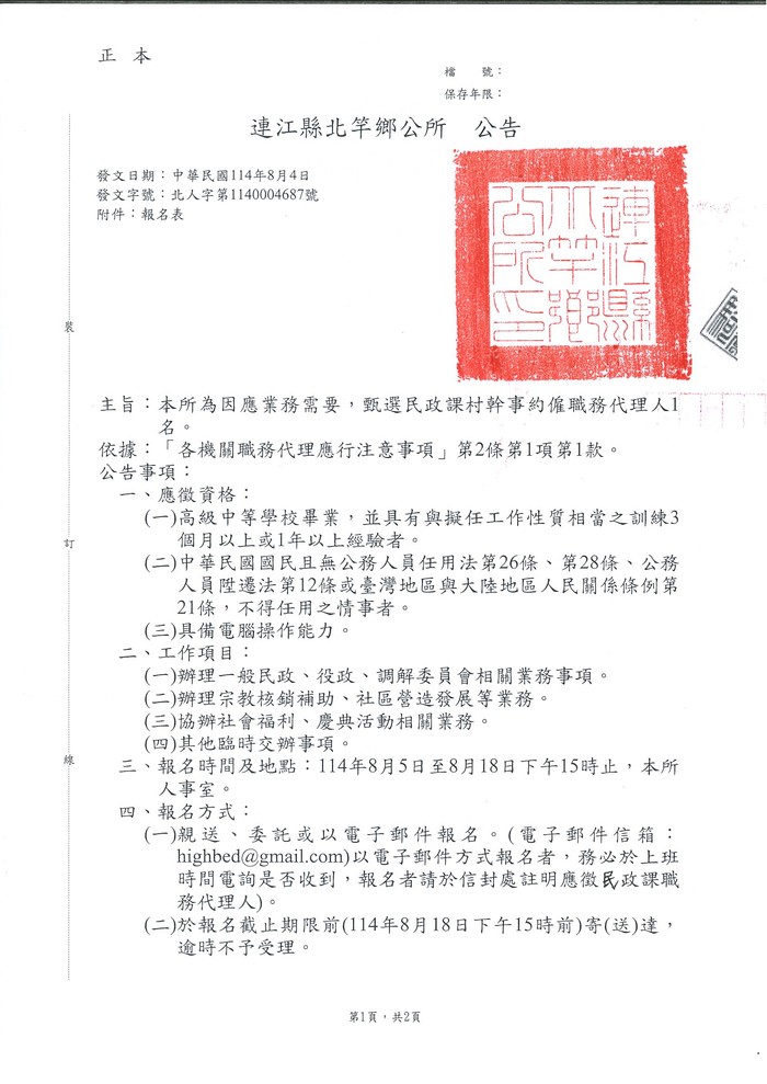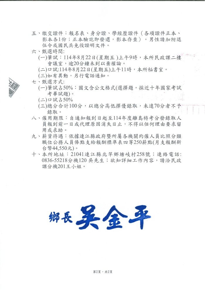 北竿鄉公所公開甄選民政課村幹事約僱職務代理人1名