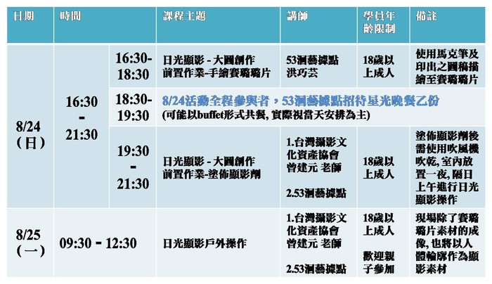 8/24-25日光顯影 53洄藝據點 --閱讀人次 : 1227 《日光顯影。體驗班》開始報名囉!