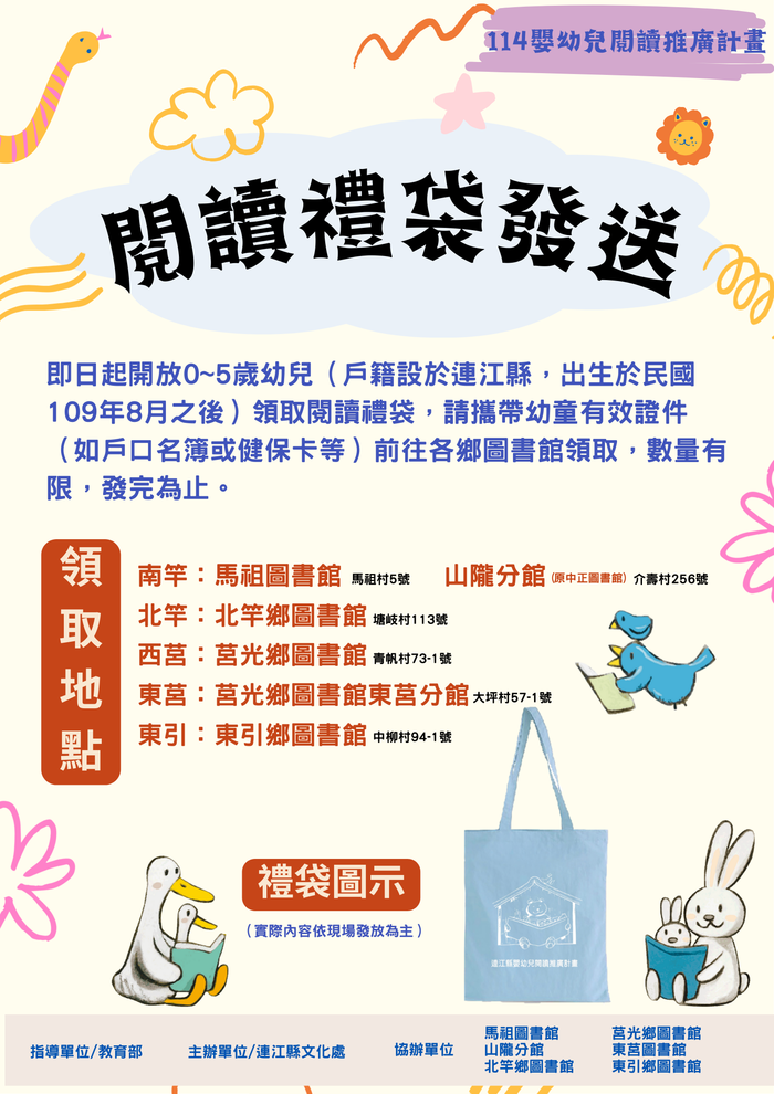 【114年嬰幼兒閱讀禮袋開領!】一起把閱讀種進孩子心裡❤️ --閱讀人次 : 806 為推廣嬰幼兒閱讀風氣,即日起推出「114年嬰幼兒閱讀推廣計畫-閱讀禮袋發送活動」,邀請家中有0–5歲小朋友的家長,一起到各鄉圖書館領取閱讀禮袋,從小培養親子共讀習慣!