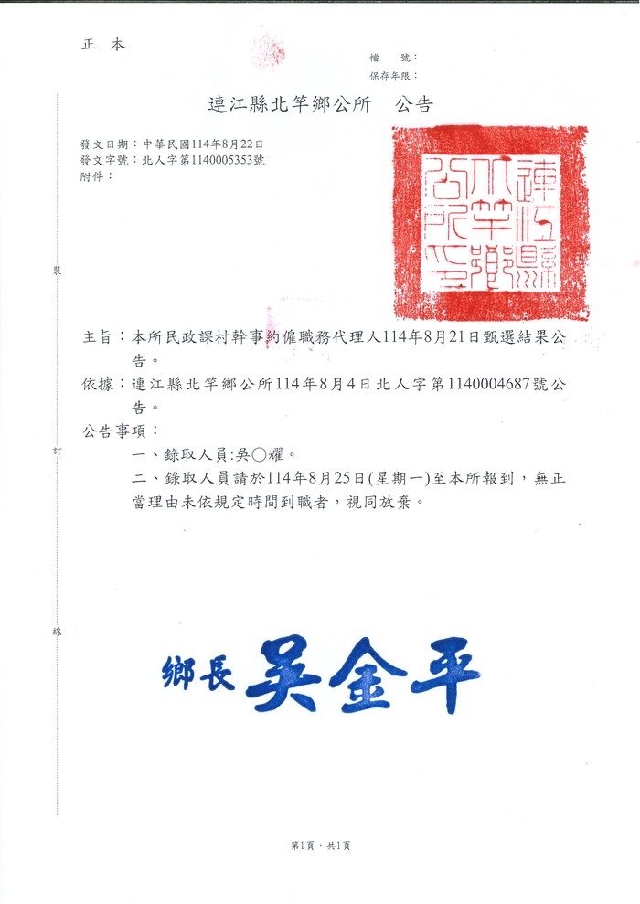 北竿鄉公所民政課村幹事約僱職務代理人甄選結果公告