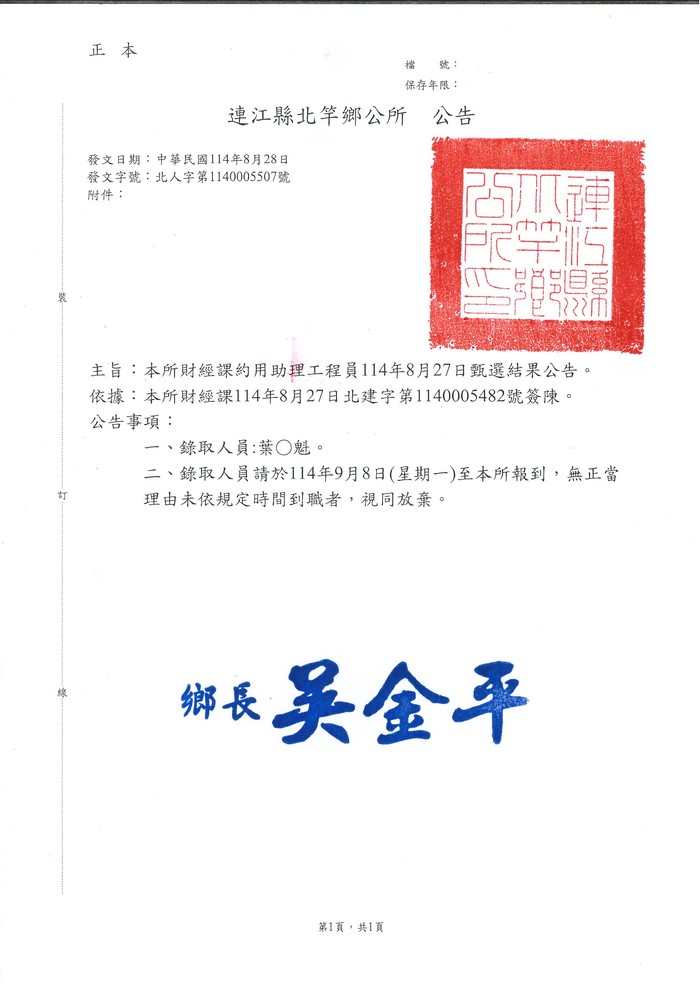 北竿鄉公所財經課約用助理工程員甄選結果公告