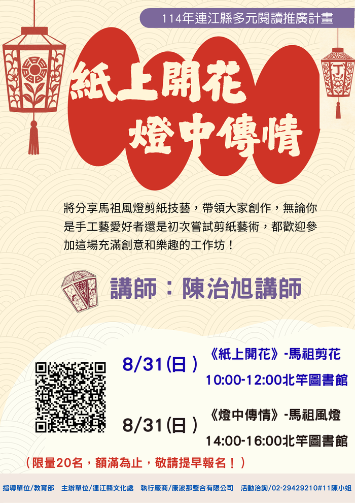 文化處將於2025年8月31日(週日)在北竿圖書館舉辦「紙上開花・燈中傳情」剪紙與風燈創作工作坊,特別邀請馬祖剪花達人——陳治旭老師親自授課,帶領民眾體驗兼具藝術性與地方文化的手作樂趣。