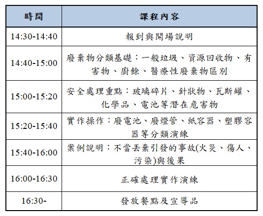 為提升一般民眾對廢棄物正確分類、處理與安全注意事項的認知,預防因不當丟棄造成環境污染、火災、毒害或人員受傷等事故,透過教育訓練強化正確行為與防範意識,共同打造安全整潔的生活環境。