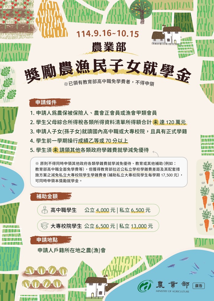 114年農漁民子女獎助學金申請 --閱讀人次 : 399 農業部為照顧弱勢農、漁民,鼓勵其子女就讀國內高中職或大專校院,並減輕其負擔子女就學之經濟壓力,設有獎助學金的機制,114學年度第2學期就學獎勵金申請期限為114年年9月16日至114年10月15日止。
