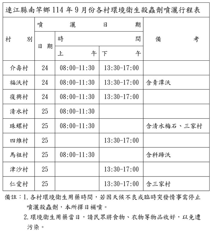 南竿鄉9月份各村殺蟲劑噴灑行程表