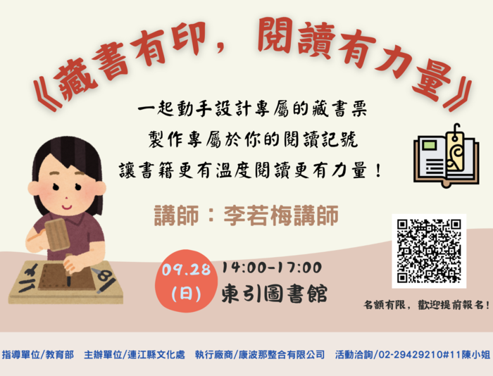 原訂於 9/21(六) 辦理的「藏書票手作活動」,因海象預報不佳、講師交通受影響,為安全起見取消,活動更正至 9/28(六) 辦理。