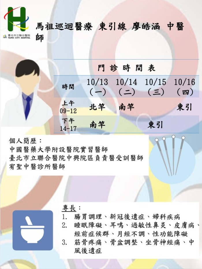 馬祖中醫巡迴醫療114/10/13-10/16由莒光線蔡宜庭醫師、東引線廖皓涵醫師前往支援服務。