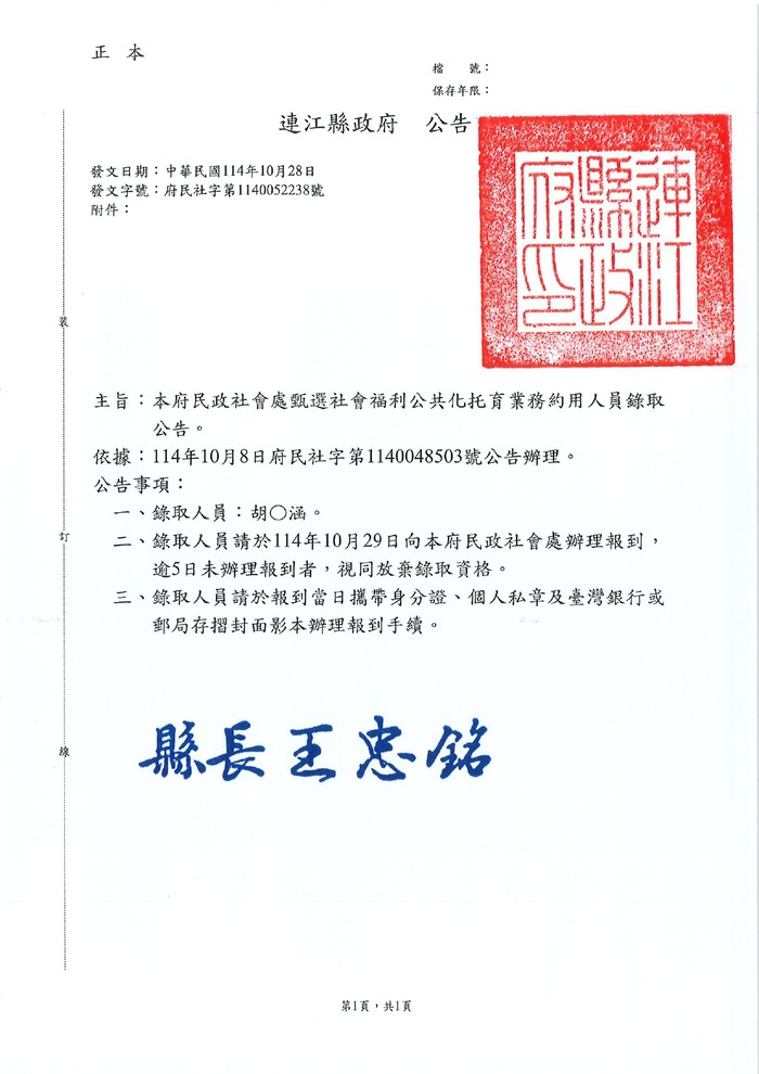 民政社會處社會福利公共化托育業務約用人員錄取公告