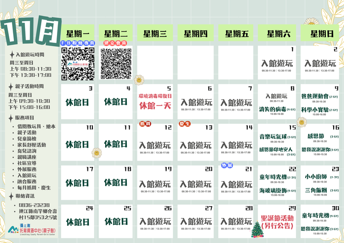 南竿親子館11月行事曆及休館公告 --閱讀人次 : 332 溫度急轉直下的十一月份來啦