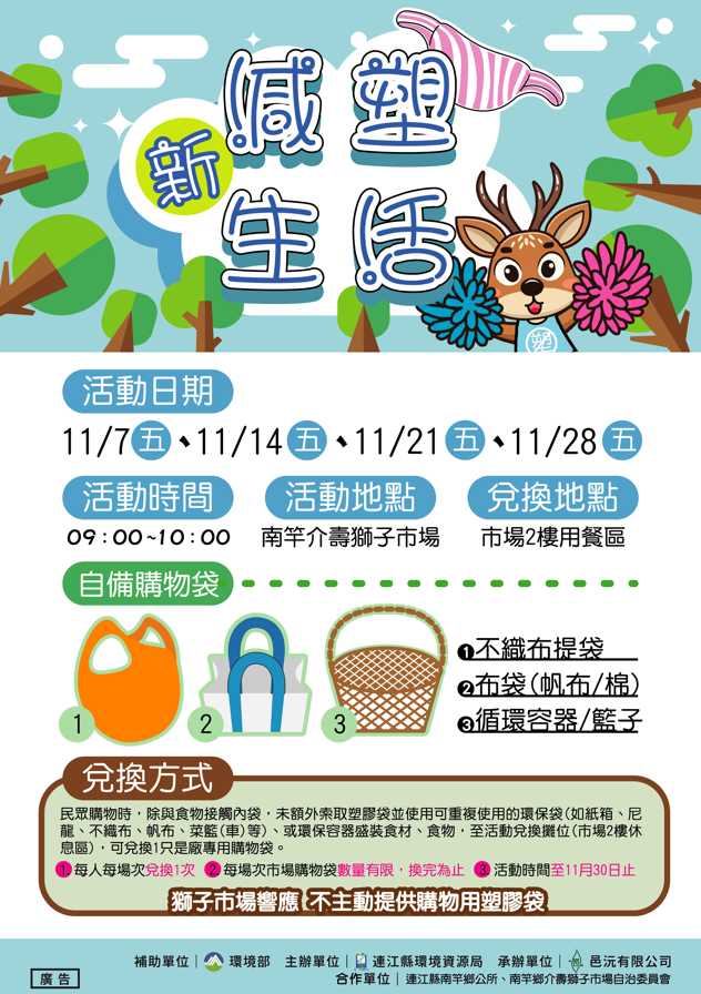 為響應減塑行動、倡導環保購物習慣,連江縣環境資源局於11月起與南竿鄉公所、介壽獅子市場自治委員會共同推動「買菜Go物自己『袋』」市場減塑活動,鼓勵鄉親在市場購物時自備購物袋,實踐「市場減塑三招」──買菜自備環保袋、蔬果儘量併一袋、不要每攤都要袋。